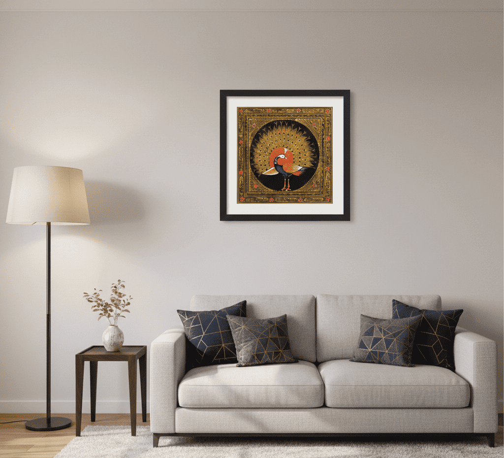 This stunning handmade peacock miniature art is crafted in the traditional Rajasthan miniature painting style. Featuring a vibrant peacock with detailed feather work, a rich black background, and an ornate golden border, this artwork beautifully represents classical miniature painting of Rajasthan.