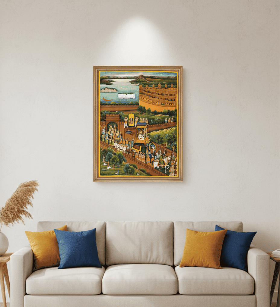 Experience the Grandeur of Mewar. Transform your living space into a royal manor with this exquisite Indian miniature painting. Capturing the breathtaking landscape of Udaipur, this artwork depicts the iconic City Palace standing tall over the serene waters of Lake Pichola. The painting beautifully narrates a "Shahi Sawari" (Royal Procession), featuring a majestic decorated elephant and a courtly entourage in stunning detail.