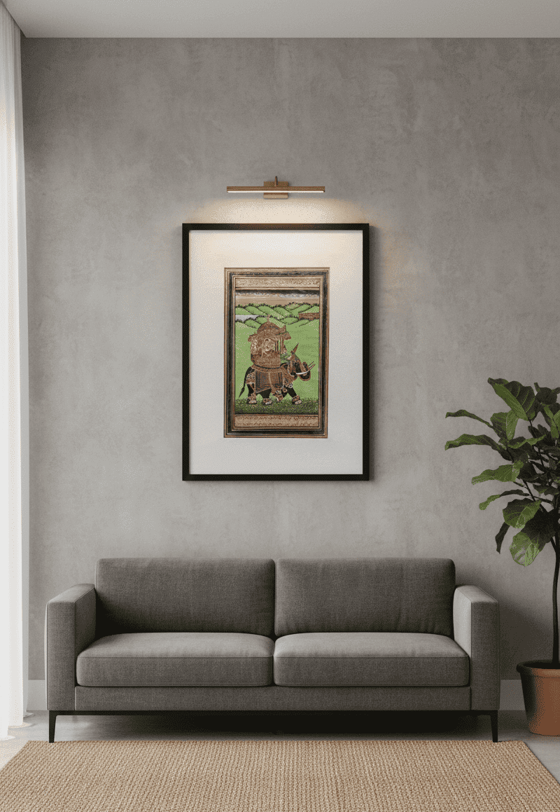 This Handmade Mughal Miniature Painting features an Indian Queen riding a majestic composite elephant, painted with traditional Mughal detailing on aged paper. A rare and artistic collectible, it beautifully reflects the creativity, elegance, and rich heritage of Mughal miniature art.