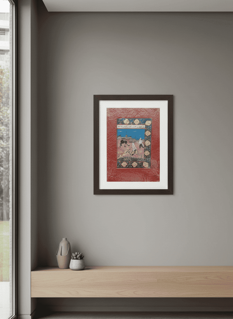 This Hunting Persian Mughal Miniature Painting features a detailed royal hunting scene painted in traditional Mughal–Persian style on aged paper. A striking collectible artwork, it reflects the heritage, precision, and timeless beauty of classic Mughal miniature art.