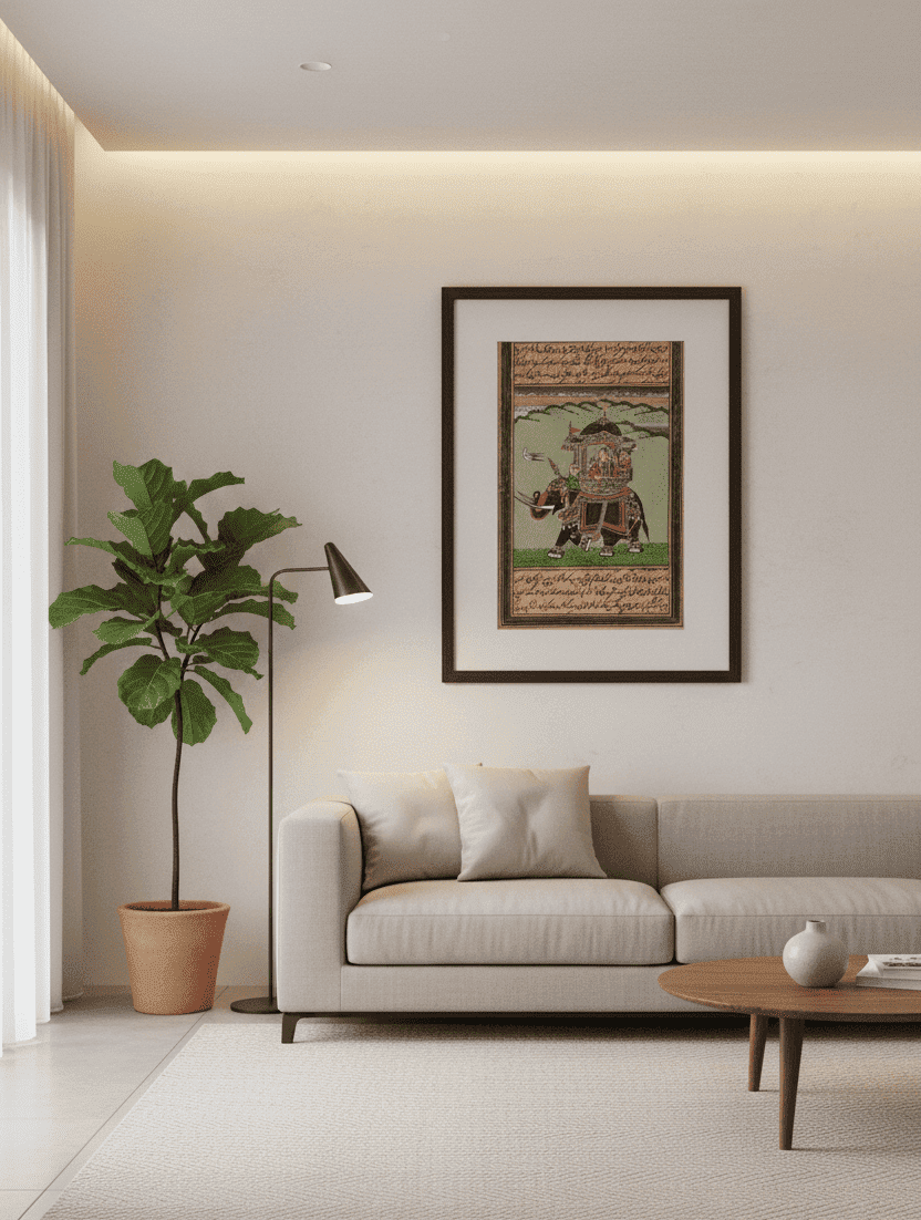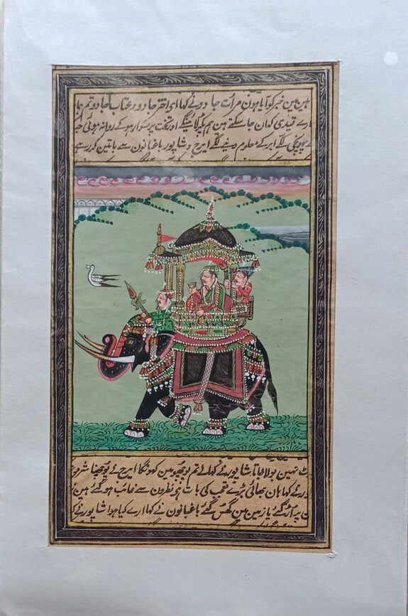 This Mughal King Riding Composite Elephant Mughal Miniature Painting depicts a majestic royal scene with intricate detailing, traditional attire, and fine craftsmanship. Hand-painted on aged paper, it beautifully showcases the grandeur, elegance, and cultural heritage of authentic Mughal miniature art.