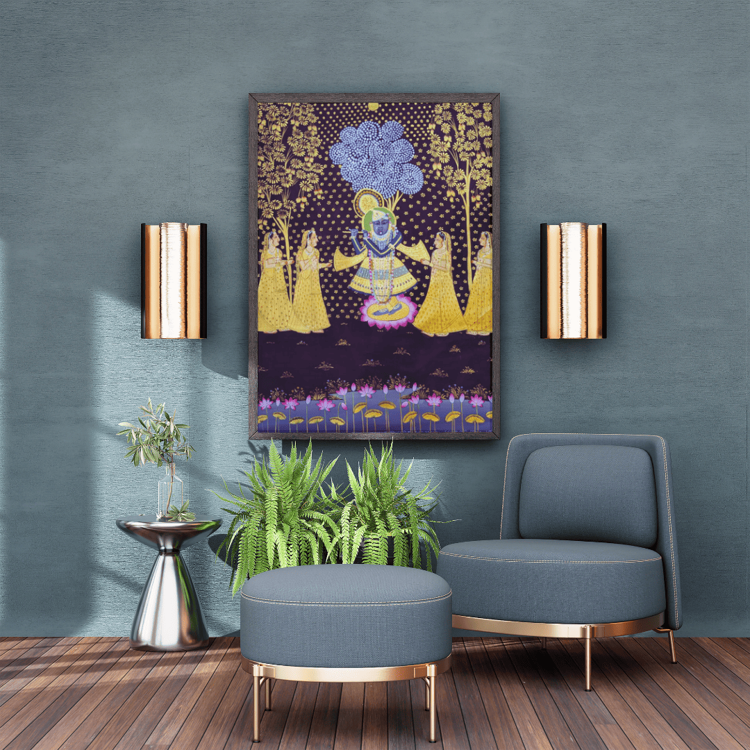 This handmade Pichwai Painting showcases Lord Shreenathji standing gracefully on a lotus,